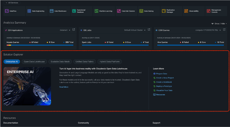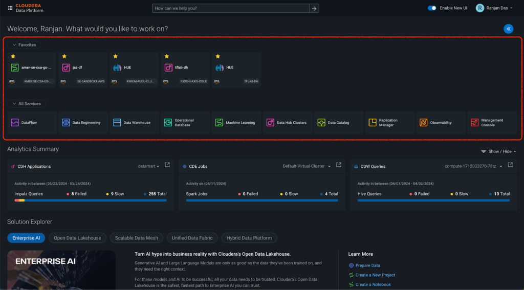 As a long-time partner to some of the largest enterprises in the world, we recognize the critical role Cloudera plays in making data teams and data consumers successful in their day-to-day work. That's why we are rolling out a significant update to the Cloudera platform homepage, including a new set of features we designed to provide a more intuitive and efficient experience for data practitioners.