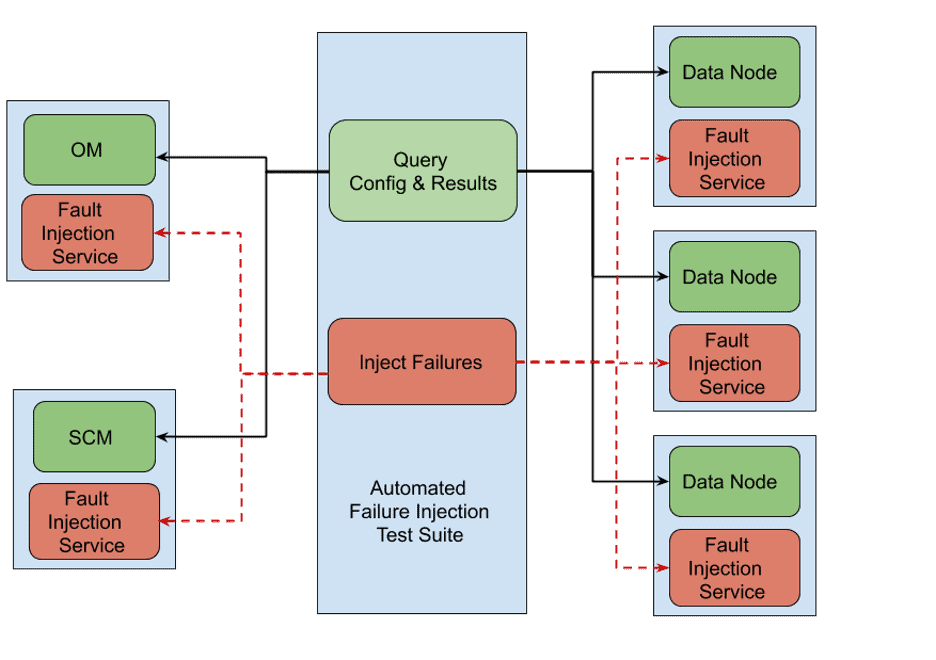 Apache Ozone fault injection framework is designed to validate Ozone under heavy stress and failed or failing system components. Specifically, this would enable injecting different types of failures in the Ozone cluster and validating system behavior in the presence of such failures. The framework is generic and extensible enough to allow injecting new classes of failures over time and writing a suite of automated test cases to validate system behavior against the newly defined failure class.