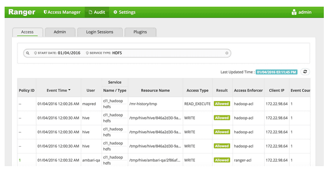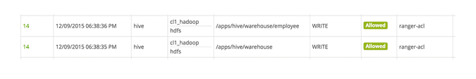 Ranger’s user interface makes it easy for administrators to find the permission (Ranger policy or native HDFS) that provides access to the user. Users can simply navigate to Ranger→ Audit and look for the values in the enforcer column of the audit data. If the populated value in Access Enforcer column is “Ranger-acl”, it indicates that a Ranger policy provided access to the user. If the Access Enforcer value is “Hadoop-acl”, then the access was provided by native HDFS ACL or POSIX permission.