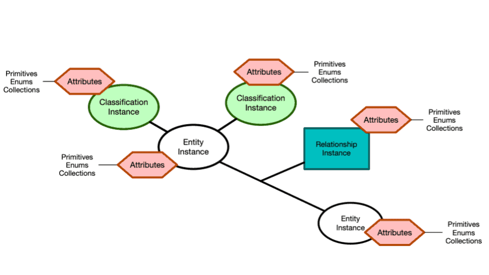 Everything is built around the core metadata model structure of type definitions and entities (see Atlas documentation for more detail):