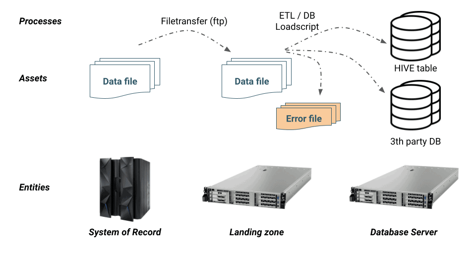 A source system (e.g. transacional core banking application) sends a CSV data file to a (non HDFS) landing zone. An ETL process then reads the file, runs some quality checks on it and loads the valid records into an RDBMS as well as Hive table. Invalid records are stored in a separate error file.