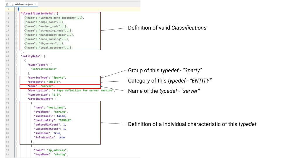 From a design viewpoint, a typedef is analogous to a class definition. There are predefined type definitions (typedefs) for all assets that occur in connection with CDP, e.g. Hive tables. Definitions that do not exist OOTB can be defined using the following syntax in a simple JSON file. The example 1_typedef-server.json describes the server typedef used in this blog.