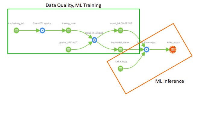 The following graphic is showing a machine learning end to end flow executed using Spark being automatically tracked in Atlas. It starts with a batch ETL Spark job transforming data from HDFS into a SQL table. A Spark model training job uses the SQL table training data to create a Spark ML model. That model is used in a Spark streaming job to continuously score incoming data from Kafka topics.
