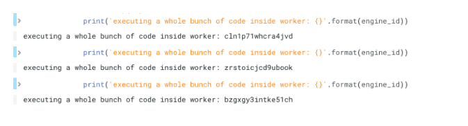 import cdsw worker_code = ''' import os engine_id = os.environ.get('CDSW_ENGINE_ID') print('executing a whole bunch of code inside worker: {}'.format(engine_id)) ''' workers = cdsw.launch_workers(n=2, cpu=1, memory=1, code=worker_code)