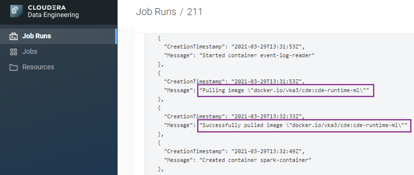 # Create the resource for the Docker container cde resource create --type="custom-runtime-image" \ --image-engine="spark2" \ --name="cde-runtime-ml" \ --image="docker.io/vka3/cde:cde-runtime-ml"