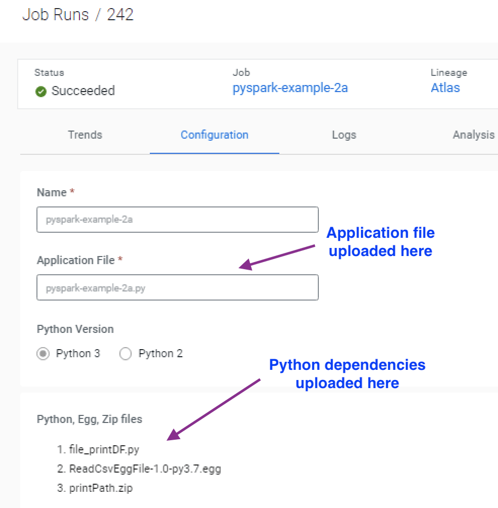 In some scenarios, the Spark jobs are dependent on homegrown Python packages. This is usually done for easy maintenance and reusability. These dependencies are supplied to the job as .py files or in a packaged format such as Egg or Zip files. For such cases, you have a couple of options for including them in the job submission. These scenarios are illustrated with the example below. In this example, the PySpark job has three dependencies (1) a .py file (2) A zip file, and (3) An Egg file which defines functions used by the main application file.