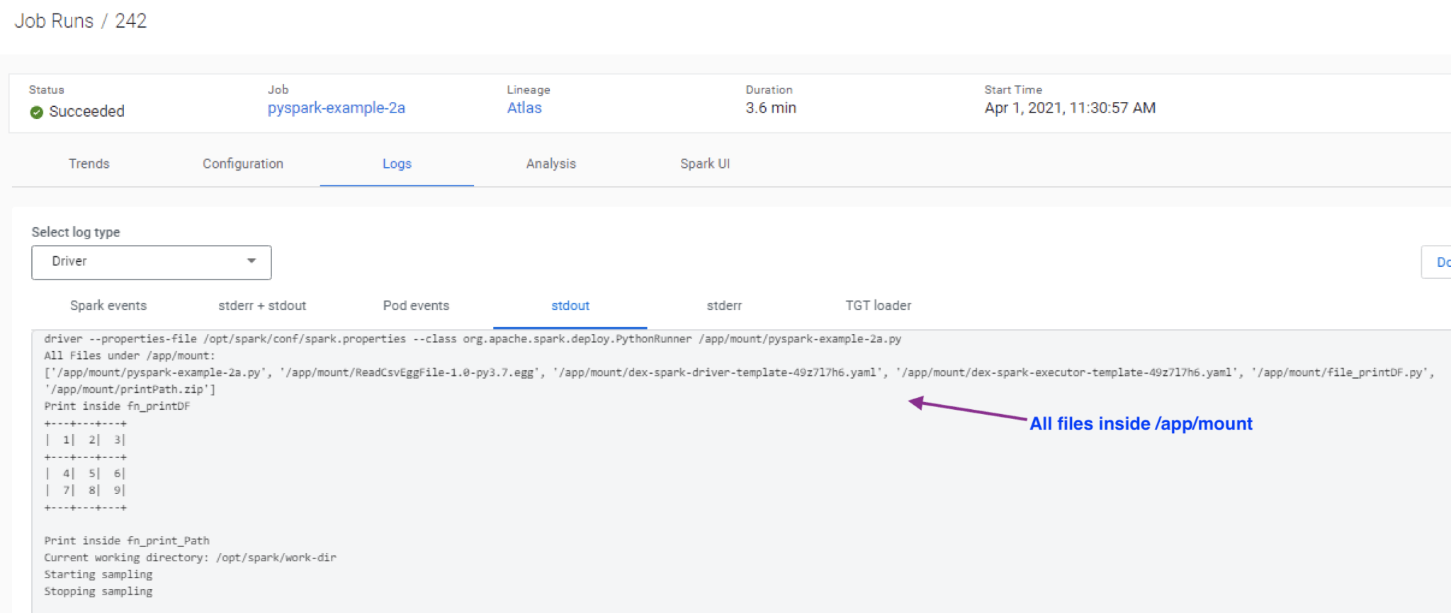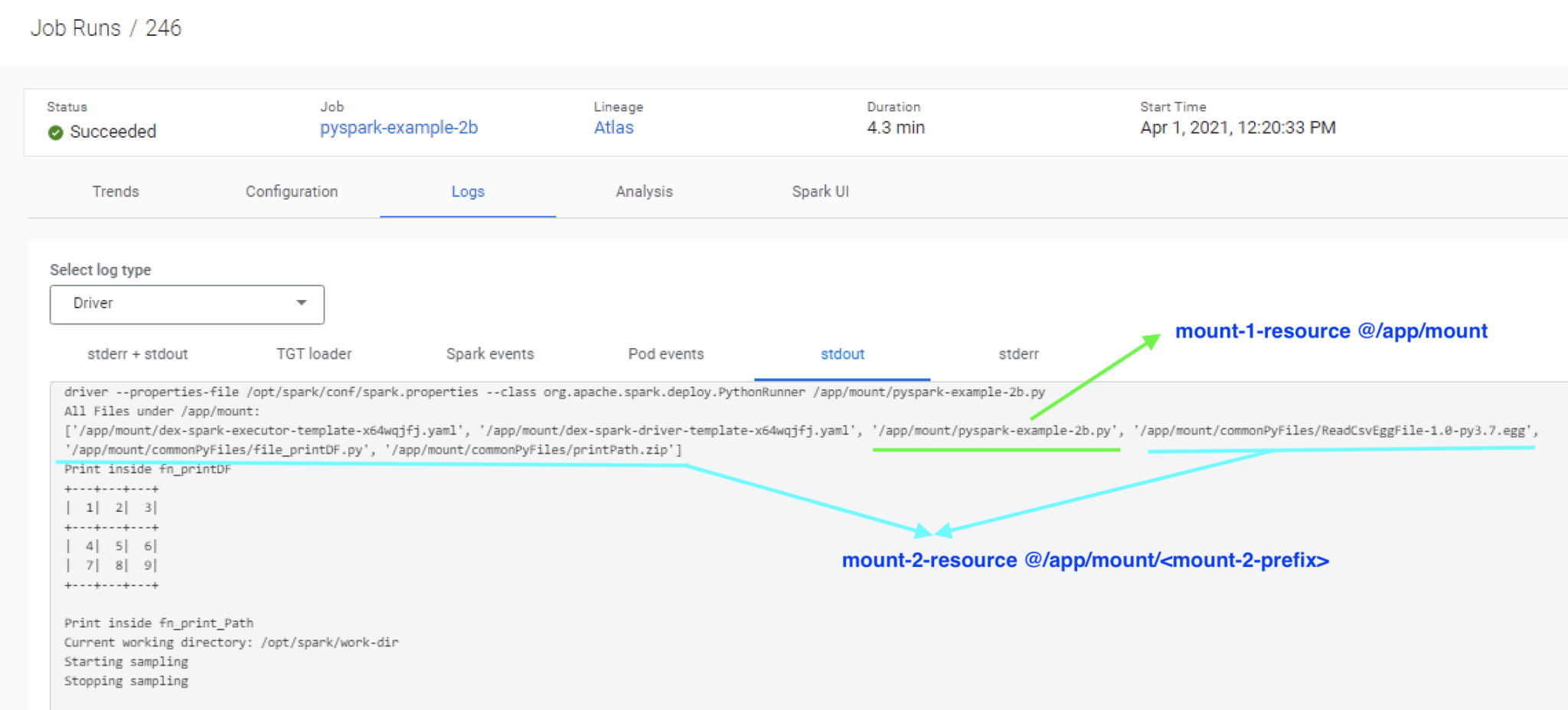 Run the following command to create the job and trigger it. Note the syntax “–mount-N-resource” pointing to the resources created in the earlier step. Also, note that each mounted resource can also be mounted to a specific path. Resources are mounted to the “/app/mount” directory which is the case for pyspark-example-2b-resource. For the common-py-files resource, the mount prefix is set to “commonPyFiles/” which means all the files for this resource will be made available under “/app/mount/commonPyFiles/”.