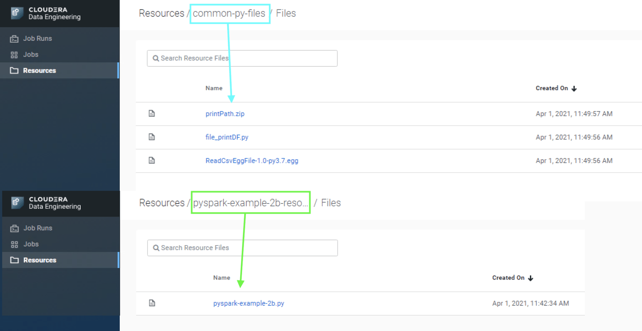 # Create a resource for the application file cde resource create --type files --name pyspark-example-2b-resource cde resource upload --name pyspark-example-2b-resource \ --local-path pyspark-example-2b.py # Create a resource for the common dependencies cde resource create --type files --name common-py-files cde resource upload --name common-py-files \ --local-path file_printDF.py \ --local-path egg-zip/ReadCsvEggFile-1.0-py3.7.egg \ --local-path egg-zip/printPath.zip