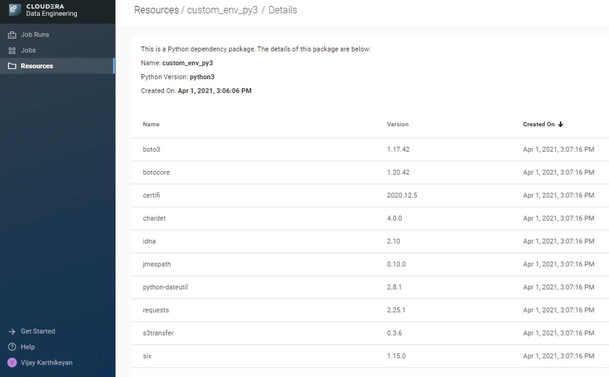 Review the status of the resource from UI or use the command cde resource describe from CDE CLI to get the status. If you try to create a job immediately then you may get the error “Error: create job failed: can not use resource ‘custom_env_py3’ in status ‘building’”. Here is a view of the resource from the UI.