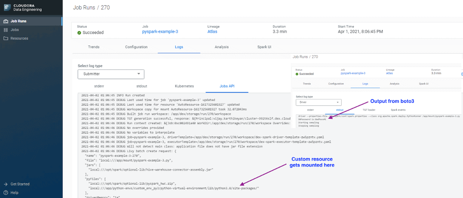 # Create job cde job create --type spark \ --application-file pyspark-example-3.py \ --python-env-resource-name custom_env_py3 \ --name pyspark-example-3 \ --log-level INFO # Run the job cde job run --name pyspark-example-3