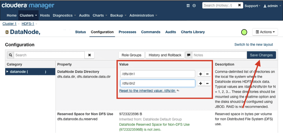 6. Reset the “DataNode Data Directory” property to add back the disk. Click “Save Changes,” as illustrated in Step 2.