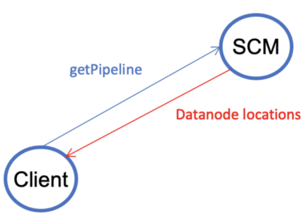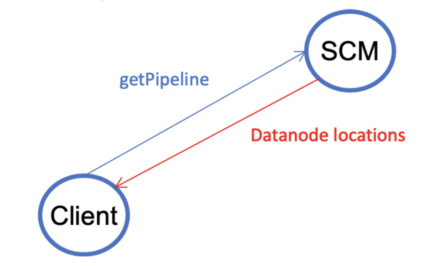 V2.2. The client uses the topology information provided by SCM to create a stream. Then the client writes to the closest datanode. Note that it does not matter if the closest datanode is the leader or a follower. The closest datanode forwards the data to the second datanode, which further forwards the data to the third datanode. Once the client has completed writing data, it closes the stream (but not the pipeline). Note also that a stream, which is similar to the pipeline in HDFS, is for writing a single block.