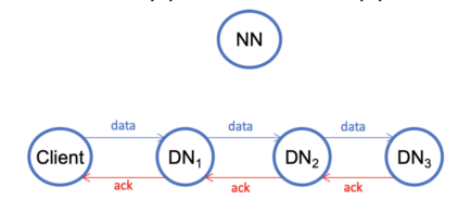 2. The client creates a pipeline according to the network distances. It writes the closest datanode DN1. Then DN1 forwards the data to the second datanode DN2, which further forwards the data to the third datanode DN3. Once the client has completed writing data, it closes the pipeline. Note that a pipeline serves only for writing a single block.