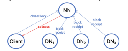 3. The client sends a close-block request to the Namenode. At the same time, each datanode in the pipeline sends a block receipt to the Namenode. When the Namenode receives a close-block request from the client, it waits for the minimum number (default is one) of block receipts before replying success to the client. The waiting for the block receipts is for preventing silent data loss when all the datanodes have failed. If the block is under-replicated, the Namenode immediately replicates it. The Namenode stores the block and datanode location information in the memory and persists the block transactions in its file system journal (a.k.a. edit-log). Since the Namenode is a central agent in HDFS, the block transaction system in HDFS is a centralized system.