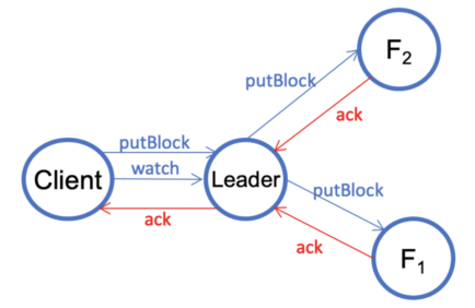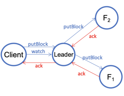 V1.3. The client sends a putBlock request to commit the block and then waits until the data is replicated to all three datanodes by sending a Ratis watch request. When the client has received a successful reply from the Ratis Async API, the request may only be replicated to a majority of the datanodes. This is the guarantee provided by the Raft consensus algorithm. The client sends a watch request in order to wait until all the data is replicated to all of the datanodes.