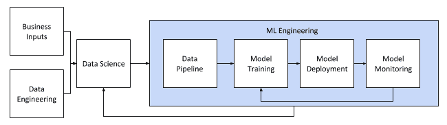 Once the data science is done (and you know where your data comes from, what it looks like, and what it can predict) comes the next big step: you now have to put your model into production and make it useful for the rest of the business. This is the start of the model operations life cycle. The key focus areas (detailed in the diagram below) are usually managed by machine learning engineers after the data scientists have done their work. ML Engineering includes (but isn’t necessarily limited to): the data pipeline (the data used to make the features used for model training), model training, model deployment, and model monitoring.