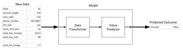 For our telco churn example, the current data representing the customer is passed to the model serving end-point; it will return a 1 if they are likely to churn, or a 0 if they are not.