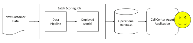 This option is sometimes considered to be real-time as the information is provided “as its needed,” but it is still a batch method. Using our telco example, a batch process can be run at night that will make a prediction for each customer, and an operational database is updated with the most recent prediction. The call center agent software can then fetch this prediction for the customer when they call in, and the agent can take action accordingly.