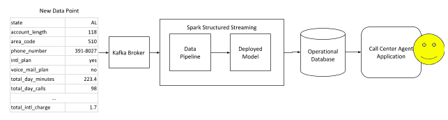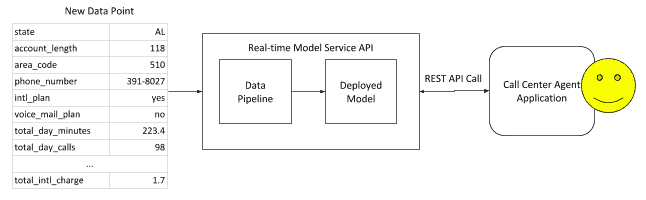 In our telco churn example, having a call center agent know that this customer calling is a high churn risk would require the ability to get a prediction in real-time. There are several deployment patterns that can be used to make this work.