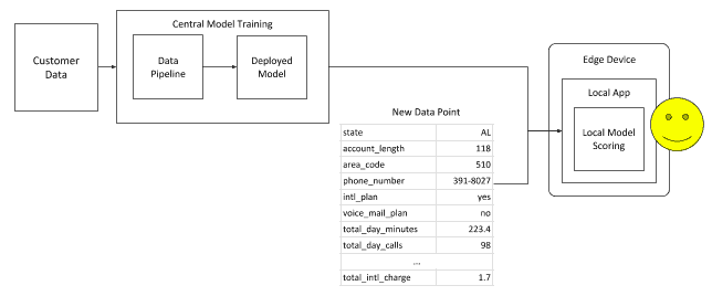 A newer, emerging model serving option is to move the ML models right to the edge and make a prediction on an edge device. This allows models to still be usable in situations with limited network capacity and push the compute requirements away from a central cluster to the devices themselves. In our telco example, if the customer is using the telco company’s app, a model on the app can make a churn prediction using the customer’s data in the application and initiate a retention action – like a special offer or discount, etc.