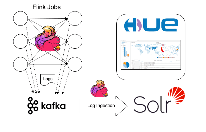 As our data processing jobs are running on multiple servers, each worker node (TaskManager in case of Flink) is producing a continuous stream of logs. These logs are automatically sent to a designated Kafka topic using a pre-configured log appender. At the same time, completely decoupled from the applications that are producing the logs, we have another Apache Flink streaming application that listens to the log messages from Kafka. This ingestor streaming job takes incoming log messages, parses them, and indexes them via our Solr search engine. Engineers responsible for the smooth operation of the streaming applications interact at the indexed logs in Solr directly or using Hue as a dashboarding tool.